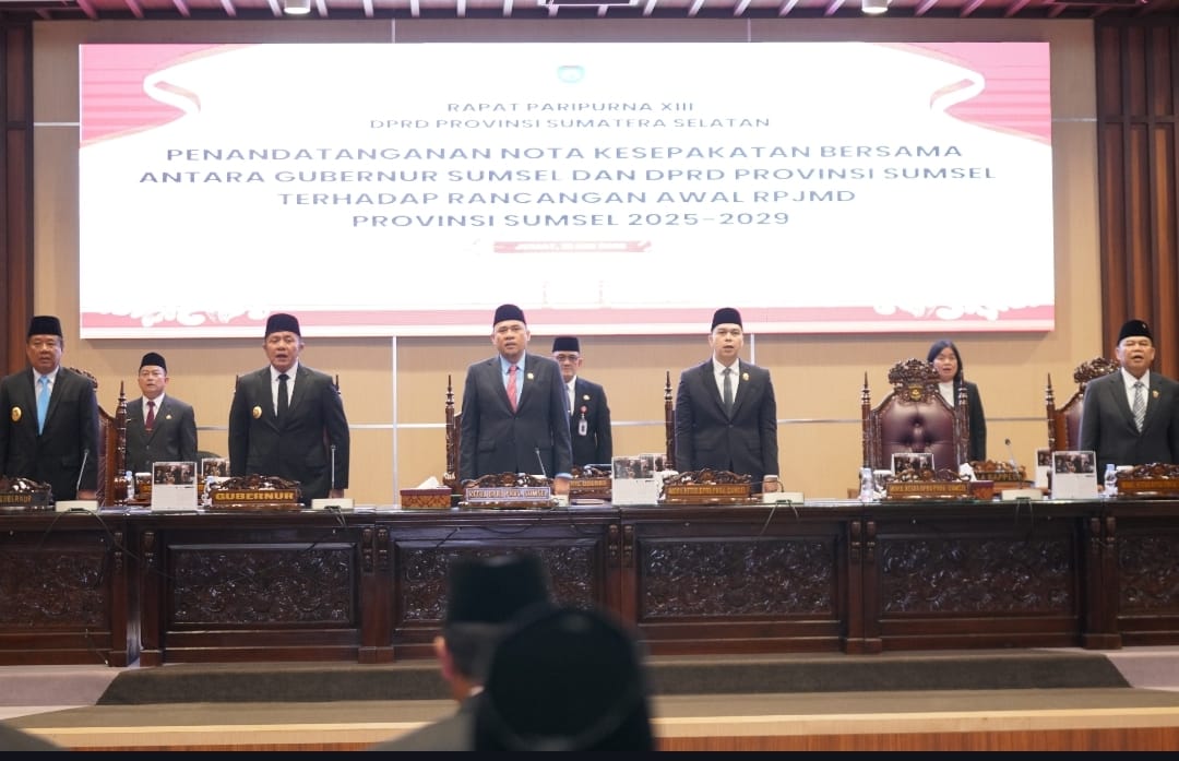 PALEMBANG, SUMSELOK.COM – DPRD dan Gubernur Sumatera Selatan menandatangani nota kesepakatan rancangan awal Rencana Pembangunan Jangka Menengah Daerah (RPJMD) Sumsel 2025-2029. Penandatanganan dilakukan dalam Rapat Paripurna XIII DPRD Sumsel, Jumat (16/5/2025).
