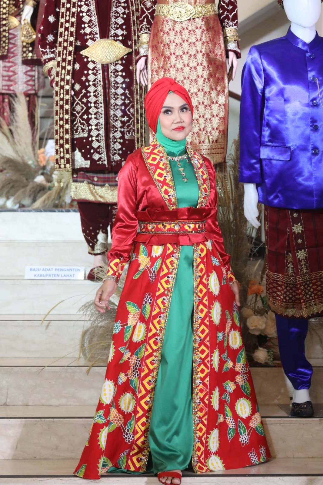 Hj Hepy Safriani,SKM,M.Kes Joncik tampil beda dengan busana khas Kabupaten Empat Lawang berbalut warna hijau merah dan motif kopi duren sangat memukau tentunya batik kopi duren mempunyai filosofi karna Empat Lawang mayoritas masyarakat petani penghasil kopi dan duren menjadi ciri khas kabupaten Empat Lawang disamping memperkenalkan batik kopi durian tentu ketua Dekranasda Kabupaten Empat lawang juga memperkenalkan kopi hasil bumi salah satunya kopi dan durian khas Empat Lawang yang sangat enak dan lezat.